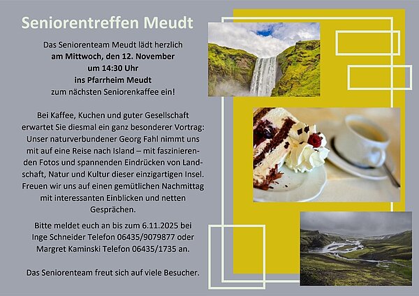 Das Seniorenteam Meudt lädt am Mittwoch, 12.11.2025 um 14:30 Uhr zu einem gemütlichen Seniorennachmittag ins Pfarrheim ein.