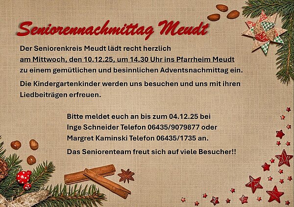 Das Seniorenteam Meudt lädt am Mittwoch, 10.12.2025 um 14:30 Uhr zu einem gemütlichen und besinnlichen Adventsnachmittag ins Pfarrheim ein.